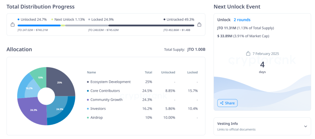 Với tổng cung của token JTO đạt 1 tỷ, hiện tại có 289.4 triệu token JTO đang lưu hành. Ngày 07/02 sắp tới, Jito Network sẽ mở khóa 11.3 triệu JTO trị giá khoảng 33.89 triệu USD, phân phối cho các nhà đầu tư và cộng đồng hỗ trợ phát triển mạng lưới.
