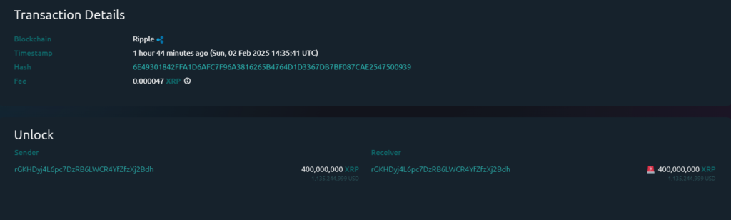 Dù không có kế hoạch mở khóa token nào vào ngày hôm nay hoặc trong các tuần tới, XRP đã trải qua một sự kiện mở khóa bất ngờ vào ngày 02/02. Theo thông tin từ Whale Alert, Ripple đã mở khóa tổng cộng 400 triệu token XRP, tương đương với giá trị khoảng 1.13 tỷ USD. Tuy nhiên, không phải toàn bộ số token này sẽ được phát hành ra thị trường ngay lập tức. Ripple chỉ có kế hoạch sử dụng một phần nhỏ cho các hoạt động cụ thể, trong khi phần lớn token sẽ tiếp tục bị khóa.