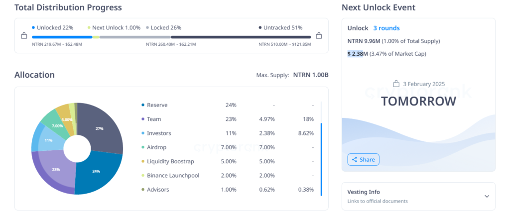 Với tổng cung 1 tỷ token và chỉ 22% đang lưu hành, sự kiện mở khóa vào 03/02 sẽ mang đến 9.96 triệu token NTRN vào thị trường. Những token này sẽ được phân bổ cho đội ngũ dự án, nhà đầu tư và các cố vấn, nhằm nâng cao sự phát triển của nền tảng.