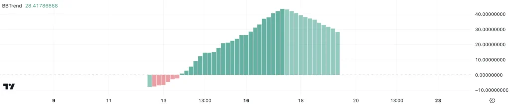 Giá của Hyperliquid (HYPE) đã chứng kiến một đợt tăng trưởng mạnh mẽ 37% trong vòng một tuần qua, nhờ vào một trong những đợt airdrop lớn nhất trong năm. Các chỉ báo động lượng như Chỉ số Sức mạnh Tương đối (RSI) và BBTrend đang chỉ ra rằng xu hướng tăng giá vẫn còn chỗ để phát triển, mặc dù tốc độ đã có phần chậm lại so với đỉnh điểm trước đó.