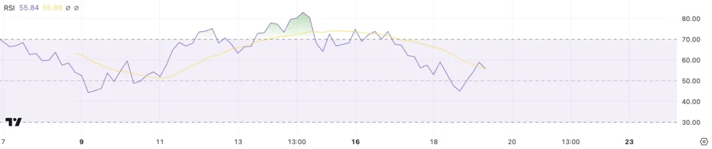 RSI là công cụ đo lường sự biến động giá và có thể phản ánh trạng thái của một tài sản: giá trị trên 70 thường báo hiệu một trạng thái quá mua và có thể dẫn tới điều chỉnh giá, trong khi giá trị dưới 30 biểu thị điều kiện quá bán, thường đi kèm với khả năng phục hồi. Với RSI đang ở mức 55.8, thị trường đang ở trạng thái trung lập đến lạc quan, gợi ý những cơ hội tăng trưởng tiếp theo khi vẫn chưa đạt ngưỡng quá mua.